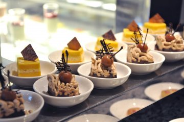 刚刚进去的时候三文鱼都切的很小的一片片 后来不知道怎么越切越厚 哈哈 吃了蛮多的 寿司味道一般般 很干 没什么品种入口的地方就是扇贝 青口贝和虾 味道一般 小青龙 雪蟹脚 海螺肉中午都没有 所以都没什么海鲜的 只能猛吃甜品值得一提的是甜品 种类丰富 味道也很好 大概有二十几个品种 都是小小的一块块 很精致的装在小碗里 小杯子装的慕斯也很好吃 唯一有个红色的大蛋糕不好吃 里面的果肉很酸很酸冰激凌也很棒 味道蛮浓郁的 可以自己加巧克力酱 葡萄干 饼干之类的 还有一个巧克力喷泉 但是好像是牛奶巧克力 很甜水果有龙眼 西瓜 菠萝 香蕉 苹果 梨意大利面是现作的 味道蛮不错的肉类都蛮好吃的 有个一小片圆圆的培根蛮好吃的 也不知道是香肠之类的 还有粥 馒头 面包 色拉 奶酪 烤羊肉 都没有尝试穿西装的那个高个子服务生对外国女生特别殷勤 哈哈~