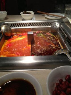 以前就知道这家店的服务有些恐怖,这回见识了一把。店在二楼,一楼有咨客。虽然不在位置上,但见有人来忙过来招呼。问明是去它家,马上每人送上一杯凉茶,然后按下电梯。出了电梯就是有服务员过来,领到座位上。点单时,服务员提醒你可以点半份。点完后,马上倒饮料,提示可以自选调料。然后上了火锅,递上布制围兜。有手机,送上塑料套;有眼镜,送上眼镜布,可以带走的。服务员很主动,看见少了饮料马上加上,涮肉时送上特别的器具,将漏勺挂在上面可以省事。总之,服务员一直忙个不停,很主动,很有眼力架。有什么问题,马上解决。就是洗手间那里,也有人解答疑问。门口还有免费美甲服务。还好,没有传说中那么恐怖,算是很周到,有种做上帝的感觉。店面不小,周六中午人不是很多,差不多有六成。装修得较酷,黑色、红色为主调。桌面比一般的火锅店大,每桌配一个手推车。不过布置得稍挤了点。门口等位处较精致,大红色的圆桌圆凳。厨房好象分割成两个,可能有各自服务的区域。洗手池旁配了不少卫生用品,像梳子、牙刷、发夹、剃须刀、牙签、护手霜、定型胶等等。第一次见到这么丰富的。。。。调料台也有两个,调料真是琳琅满目。有香菜、小葱、海鲜酱、菌菇酱、牛肉酱、沙茶酱、蚝油、麻油、芝麻酱、花生酱、辣酱、酱油、蒜、韭菜、牛肉、花生。。。。甚至还有芥末。品种太多了。上面的牌子上写有用法,不过大家都随便配。最喜欢菌菇酱,很鲜很香。还有四个凉菜:薄百叶、黄瓜、番茄、橙汁。调料是无限量的。饮料也是无限量的,有酸梅汤、凉茶和豆浆可以选择。锅底较贵。其它涮料同别的火锅店差不多,只是滑类、丸类品种多一些。特别的是除小吃外可以点半份。鸳鸯锅底:辣的那边是现拆的包装,可以选择量的多少,令人较放心。不辣的是三鲜的,料较多,有虾米、百叶、平菇、肉丸。汤色乳白,蛮鲜的。点了特级肥牛、鱼滑、撒尿牛丸、蟹棒、薯粉、蔬菜拼盘、炸豆皮、厚百叶。鱼滑和炸豆皮很喜欢。本来点了功夫面,但吃不下了,给退掉了。涮料都较为精致,也就是量小,但都很新鲜。总的本说是各方面都很好,就是价格小贵,感觉没吃什么东西,价钱就上去了。查看更多