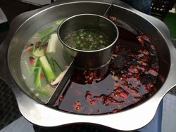 这家店交通比较方便,好找。装修的简单大方,气氛不错。有自取的免费开胃小菜,味道像是四川泡菜,萝卜莴笋圆白菜等,酸酸甜甜的,爽口开胃又解辣。麻酱小料也是自己调配的,各种配料是单独放的,根据个人口味自己调,很人性化。鸳鸯锅底量很大,白汤一侧有葱姜香菇等等,汤底很鲜;麻辣一侧的红油很给力,麻和辣的味道让人很有食欲。梭边鱼是火锅里的特色,鱼很新鲜,而且厨师已经切成一块一块的,吃着很方便。鱼很新鲜,在白汤里煮好之后的鱼肉鲜美无比,肉质鲜嫩,鱼皮也不腥还能补充胶原蛋白。在红汤里煮后麻辣味渗入鱼肉,吃下去很给力。火锅粉卖相不错,很整齐,涮好后口感很劲道,很香。蔬菜拼盘里的蔬菜种类很多,生菜白菜金针菇粉丝茼蒿等等,都很新鲜很水灵,营养均衡清香爽口,很适合在火锅中吃。牛脊髓分量挺大的,很新鲜。牛脊髓软软的,涮熟之后也是柔软的条状,很好咬,口感和肉类很不一样。是一层薄薄的膜里面包裹着酸奶装的骨髓,煮好后微微发胀,口感细腻绵软。…查看更多