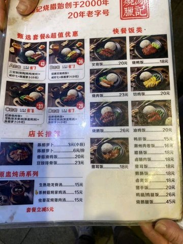 招牌烧鸭 / 烧鹅饭 / 烧鸭拼猪耳饭 / 叉烧烧肉饭 / 三宝饭 / 老火靓例汤