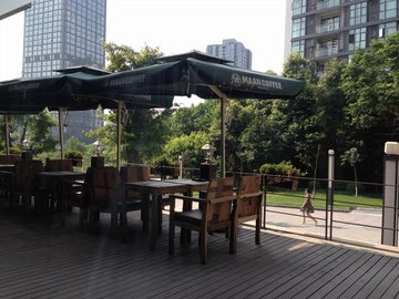 漫咖啡,先前就有所耳闻,由于地处财富中心,对于偶来说有点远,所以一直都没有去的。和小伙伴终于结伴去了这家店店了。从外面看,觉得LOGO倒是很大,感觉一般的。进门以后才看到,店的面积好大哦!分上下两层,楼下是无烟区,楼上是吸烟区。桌椅的摆设也挺有特色的,灯饰也是。我觉得他们家的椅子在这里好像是个椅子博物馆。透明靠窗玻璃整整的一大墙壁都是的。外面也设有座位区域,可以看到湖水的。通往二楼的楼梯处,好大一壁书柜的装饰哦,看上去很是霸气。点单处有玻璃橱柜,摆好了很多事物的模型,写好了餐名和价格,使得点餐更加的想象化,这个挺好的。点好餐以后,会给一个很乖的熊熊,表示了你所点的东西,服务员上完餐以后会把这个熊拿走的。熊熊的衣服上面也有他们家的LOGO哦。他们家的拿铁,我觉得味道一般,不知道他们家用的什么咖啡豆来的。用的高的瓷杯装的。卡布奇诺,拉花拉得不错,味道还可以吧,这个喝拿铁杯子就不一样了哈。分得还是很清楚的。白提拉米苏拿铁,上面洒了提拉米苏的吧,我觉得味道甜了些,还是原味的好些。每点一杯饮料,他们家都会送面包条的,感觉味道挺好的。这点做得很是人性化。缓解了喝咖啡以后的饥饿感。芒果果汁,味道我也觉得一般。卖相还挺好的。在这里我觉得是环境很舒服的,但是由于去的时候是周末的下午,人很是多,基本都是坐满了。反倒觉得很是嘈杂了一些。