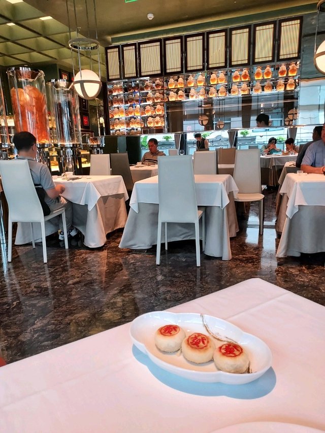 一入座,侍应先奉上迎宾茶:用陈皮、佛手柑煲三小时出来的金黄色茶,入口甘甜清香。我们点了三款茶:鸭屎香、茉莉、龙井,茶叶都是高级、无茶渣。餐前小点心:黄皮豉绿豆糕:用绿豆粉做外皮,馅料是黄皮果肉,创新、清甜开胃👍点了二款潮汕菜中常见的家常菜:平凡中出功夫,只有能把家常菜做到了美味,而不只是依靠名贵食材、鲍参翅肚等去烹调菜肴,只有这样,才算是三星级的米其林餐厅。翅汤南澳珠瓜煮腩肉煲:也就是白玉苦瓜加猪腩肉煲。苦瓜肉很厚实,看得出是精选的白玉苦瓜;腩肉也是精选优质,吃得出的优质。整道菜做得非常好吃,未吃过如此美味的苦瓜煲。酸姜香芹炒吊龙:这道菜除了严选优质食材之外,还看到了厨师的优秀刀工与一丝不苟。酸姜被切得一般的粗细、长度整齐;配合芹菜和牛肉炒,口感酸甜爽口、牛肉嫩滑,无以挑剔的美味。主食点了老菜脯包菜花胶戈饭:食材的焦点是优质花胶与腌制了三十年的老菜脯。用的优质老菜脯则是借用了它的甘、咸、香,从而提升整煲焖煮米饭的风味。加上切得细细的蔬菜丝、菇、虾米、干鱿鱼丝、葱花等,使这道焖饭生色不少。花胶入口软烂美味,显出厨师的高超烹饪技艺。焖饭香、不油不腻,咸度适中,一绝👍甜品:单丛茶炖奶,以潮州的单丛乌龙茶汁加牛奶炖制。入口有清香的茶味,不太甜,很有特色的甜品。自制酸奶:在酸奶上面,加上了餐厅特别制作图案及文字,很有心❤️入口爽滑,甜酸度适中。餐厅的装饰典雅高贵、安静舒适。侍应的服务态度良好,还有专门的侍应为客人介绍菜单及所点的菜品,提供优质的服务。这样的餐厅,从细微处下功夫,家常菜也能享受到顶级的美味。三星级奖牌乃实至名归。…查看更多