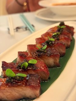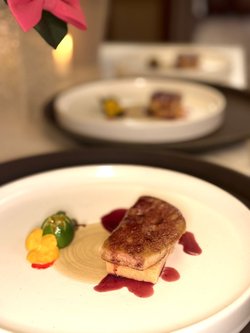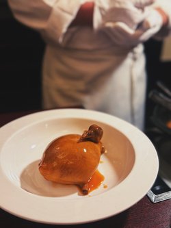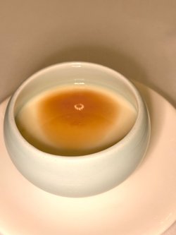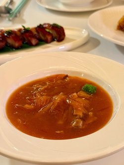 我终于亲身试到,仙鹤神针。🙂🙂每日限量,师傅以乳鸽去骨填入鱼翅,炖至汤汁金黄,鸽肉嫩滑、鱼翅爽口,确实是传统粤菜的功夫之作。蜜汁叉烧肥瘦均匀,外层蜜糖脆壳配上意大利黑醋,甜香中带果酸,平衡得宜红酒鹅肝则是冷盘,入口柔滑,酒香渗入油脂,浓郁却不腻,虽然没有煎香的脆口感,但冷食的方式反而突显鹅肝的细腻质感。