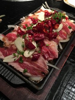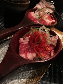 这家火舞炭烧在鎏嘉码头的水族馆旁边,环境还是很好的。浓浓的日式风格,菜品比较精致,菜名也取得不错,让人眼花缭乱了。和小伙伴们一起点了20几个菜。三文鱼腩和金枪鱼刺身很新鲜,牛舌刺身很好吃,很薄,价格小贵。其他菜也不错,从服务员帮我们专心烤肉和开放式厨房上认真的摆盘可以看出是在很用心经营的。饮料是热的,如果换成冰的就好了,毕竟嘴里吃了那么多烤肉和热的东西,还是想要冰的来调节一下。乌冬面果然还是比较喜欢炒的啊,不喜欢汤乌冬,也不喜欢那个炒饭。最后感觉,仍然比较喜欢韩式烤肉生菜包五花肉的吃法,没有生菜的日式烤肉最早接触还是在上海,也是很久很久没吃了。现在在这里吃到还是感觉,食材口感一般,味道一般,而且大家都没吃饱,价格偏贵了,不过吃的是环境和服务吧。PS:如果是大晚上来吃,建议不要开车,在门口堵成狗了。