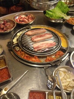 炭韩国烧烤里面的牛舌,猪皮,五花肉都很好吃,对于无肉不欢的朋友来说吃的好欢乐,牛舌烤的时间不宜过久,稍加几次翻面之后就能吃,因为切的比较薄,咬起来相当的嫩而且还有点咬劲,猪皮处理的已经很干净了,烤熟以后再剪成小段的,咬起来那是相当的有弹性啊,韧性十足!五花肉肥瘦正好,关键是厚实,香味扑鼻啊~~期间还吃了边上槽槽里面的蛋和泡菜,味道也很灵哒。…查看更多