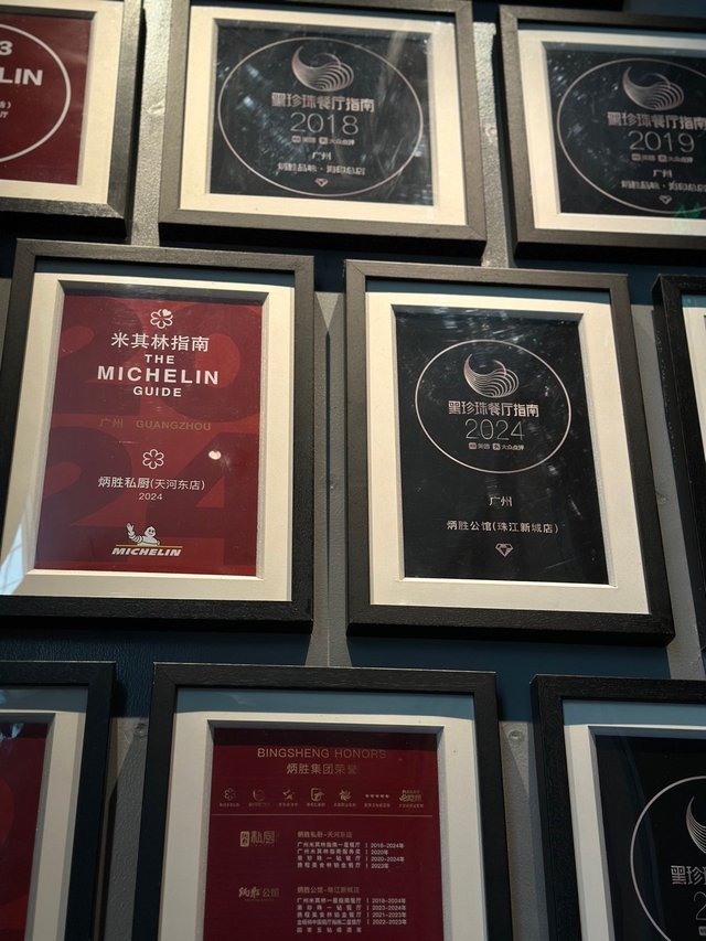 [炳胜品味食評]於2024年9月4日到訪。有着米其林稱譽的粵式高檔餐廳,假日食客眾多,難得這個平日午餐時段人數比較少。穿過走廊時,見到整面牆都是米其林、黑珍珠獎項,心更頓整下來,嘴巴更期待美食。藤椒蝦餃皇🦐 [必食]點心精緻,皮薄餡靚,像小籠包汁水飽滿,帶點藤椒味,但又不帶辛辣感,只是微微的椒香,蝦肉新鮮爽口。砂鍋米酒焗清水大頭魚🐠未上菜,先以味覺打招呼。薑蔥爆香,加上米酒,魚肉帶有酒味,不過偏多骨頭,我也略嫌這道菜少了咸的元素,味道較淡。煎酿脆皮辣椒炒紅魷🦑金不換炒了青辣椒及魷魚,每條青椒更釀了鱈魚及蝦仁,是道心思菜,且味道不錯。剁椒蚌仔蒸自制山泉豆腐🌶️他們家的豆腐用上山泉水和蛋清做成,黑豆味比白豆的挺出,香滑。我喜歡他們的蚌仔新鮮,薑絲的香氣,令海鮮更吸引。姜汁棗皇糕🫚姜味比紅棗更搶鏡,外表晶瑩剔透,不過密度不夠高,比較黏口,不夠硬實,但勝在新鮮出籠,熱滾滾的。金橙酥皮蛋撻🥚雖叫金橙,但完全沒有橙味,酥皮香脆,雖多層但又不會很厚粉感,且裏面的蛋汁非常香,半流心狀態。懷舊炒河粉🍜圖片看似乾炒牛河,鑊氣足夠,瑞士汁比例較高,少種鮮鹹味,唯一不同的是用多韭黃菜,牛肉味不夠香濃,不過價錢實惠。炳胜品味扎根在廣州,着重出品、環境、服務等,這些都沒大問題,只是食品,我期望更高水平。-餐廳出品的月餅雖得獎,但味道一般-餐廳包廂比較小,大概只能接納8人地址: 宝安南路华润万象城一期L599…查看更多
