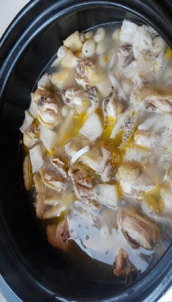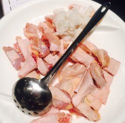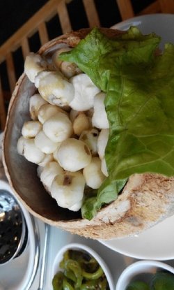 这个上来是一个砂锅,里边放置着炖好的鸡,像是柴鸡,肉质很紧实。味道有些甜,因为现场打开椰子把椰汁放进去,吃法很新鲜,沾着小料味道还行,就是难啃。价格偏高,格调适合情调小聚。查看更多