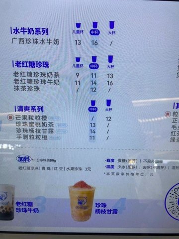 老红糖珍珠鲜奶 / 老红糖珍珠奶茶 / 珍珠杨枝甘露 / 煲红豆生椰 / 煲青稞奶茶 / 毛尖奶绿