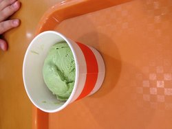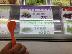 有张券,可以换一个单球。其实我想吃红梅口味的,可是小孩子还是喜欢吃抹茶。怎么就那么爱抹茶口味呢。。。。。随便啦,反正都很好吃。。。。这个天气一个人吃这么凉的有点多,2个人分正好。。。。喜欢他们家的小勺子。。。。好看。