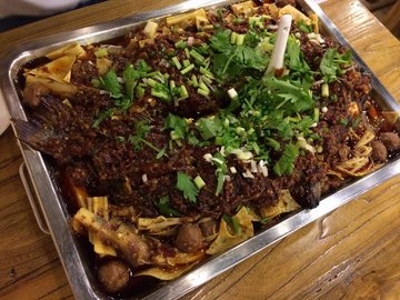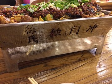 独门冲店名起的挺独特的,老字号的店,价格不贵,环境一般。喜欢吃鸡翅,所以点的干煸翅中,鸡翅挺入味的,香辣适口,鸡肉鲜嫩,里面的蒜苔吃着甜甜的,味道不错。炸馒头片很酥香,吃着不油,味道很赞。烤鱼一般,配料很碎,味道偏咸。