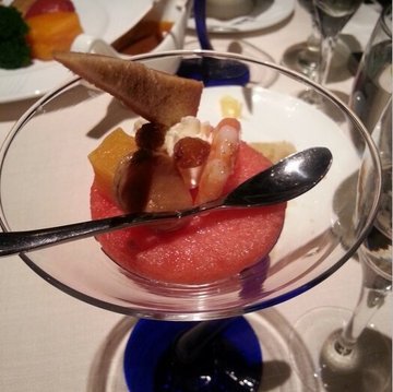 去过很多次了,有时候预约,有事临时起意想去。因为提前预约,所以有布置桌面,也就是玫瑰花瓣装饰。菜品方面因为有事先看过,所以点的还是蛮顺利的。本来看中菲力的,但是菜单里没有了。主食要的是台塑和皇家色拉是鹅肝和凯撒汤是玉米和意虾甜点是巧克力和抹茶。因为兑换了白金卡,所以先送上了一小瓶的红酒,蛮精致的2009年的货色。主厨特色菜(白金卡送):底是西瓜和猕猴桃丁做的,上面有大虾仁和鱼子酱,不过味道怪怪的生日还会有生日蛋糕,纪念日也有蛋糕的!东西真心的一般般啦!