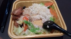 这家店位于新龙城小区西门对面底商。点了碗田老师炭烧鸡肉饭。鸡肉切得非常薄的片,可以看到鸡肉的纹理,鸡皮都带在肉上面。吃起来鸡肉软并且有点红烧的味道。蔬菜应该是用水抄过,保留了碧绿的色泽而且入口脆却不生。