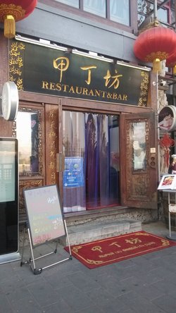 甲丁坊,地址位于西城区地安门西大街51号荷花市场9号。地理位置非常好,门前就是后海,景色怡人。酒吧性质,主要生意都在晚上。装修风格是中西结合,名字和建筑外观以及大红灯笼都是传统的中式风格,不过门前还挂着各国的国旗,告诉你这家是中西餐合壁的。总共有两层,一层开了好几个门,一个大落地窗,在临窗/门的座位吃饭,和外面如织的游人真是近在咫尺。进去之后可以看到,中西合壁的风格更是明显,古色建筑搭配了现代风格的装饰,倒也不显得突兀。大吧台上摆满各种各样的酒,告诉你其实这里是一座酒吧。二层的风格更偏重于西式,临床的大沙发半包厢相当给力,白天和晚上都可以饱览后海不一样的美丽景色。中午去的,没什么人,不过饭做得依旧很慢,也许白天只留一个厨子吧。这样的位置、风格和酒吧元素,注定了这里的菜价不可能太亲民。菜的种类挺多的,以西式为主,兼有一些创意菜,菜价比较高。甲丁坊北京烤鸭PIZZA,8寸129元,点这个完全是为了尝鲜的,知道这样的pizza味道应该是不如传统口味pizza的,但仍愿意尝试一下。从外观上看,方形的,造型看起来不像传统pizza,鸭肉和鸭皮融入了饼底之中,在芝士的作用下埋藏得更深了,上面撒了甜面酱、葱丝和黄瓜条,完全的北京烤鸭的节奏,事先被切成了9个方块,吃起来相当方便,鬼使神差地,我们是把小方块卷起来吃的,热的时候吃口感不错,基本就是加了芝士的北京烤鸭卷饼,凉了之后基本就没办法吃了,鸭油,你懂的。双菇木耳黄牛肉,89元,量不大,滑子菇和木耳,加黄牛肉,是道重油的菜,很香很下饭,黄牛肉确实口感很好的。酸汤肥牛,69元,量少不说,完全没有酸汤的味道,牛肉片很嫩,牛肉和汤几乎是一点儿酸味都没有的,造型看起来是酸汤肥牛,但也许厨师忘记加酸料了。黑松露卡布奇诺奶油,49元,名字很特别,造型也很特别,上来的时候是套在一锅粗的透明的管里的,然后服务员会帮忙提起这个管子,汤自然洒落在盘子里,造型还保持得不错,西式味道很浓的奶油汤。叉烧骨汤面,69元,这个价钱的面条想必应该是极其美味了吧,但实际上相当令人失望,面条跟在水里泡了好久似的,软啪啪的没有任何口感,汤也几乎没有任何味道,味同嚼蜡的感觉,而叉烧也相当不给力,作为招牌,只能说是相当令人失望了。开胃面包:面包干很酥脆的。综合评价:价格高、环境好,服务员美,几道菜褒贬不一。…查看更多