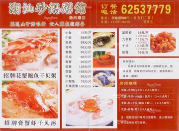 潮汕砂锅粥位于静安区新闸路868号,在这里喝粥,才真正感受到啥叫粥文化。这里的特色是砂锅海虾粥、砂锅膏蟹粥。把海鲜煲粥,已经不是清洗肠胃的粥了,而是滋补养身的粥了,里面海鲜的美味一点也不亚于热炒海鲜,喝粥时感觉就是在喝海鲜汤!…查看更多