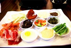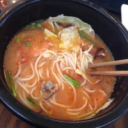 去之前从没听说过的一家做米线的小店铺,名字起得超级可爱,番茄妹米线,红彤彤的小番茄哟~第一次吃点的是招牌的番茄过桥米线。汤底是番茄味道的,很浓郁,端上桌子的时候滚烫滚烫的,用勺子搅拌了一下,可以看到汤底里面有被煮的烂烂的番茄小碎块,然后配料的话都是装在一个一个的小碟子里面单独放的,粗看了下,杂七杂八的食材还挺多,有玉米粒,午餐肉,虾仁2只,肥牛肉一点点,然后再一些素菜,趁着滚烫的锅底然后把食材全部下到锅子里去,等待一会儿,然后拌一下就可以吃了,服务员会提醒小心烫嘴,这点还是蛮贴心的。和桂林米线那种还是有区别的,口味其实还蛮温和的,番茄味道特别的重,米线蛮细的。然后他们家米线可以无限追加,但是追加后的米线放在锅子里有点烧不开的感觉,所以后续追加的米线就不好吃,有点硬硬的,还是最初的那个米线比较好吃。总体一般般的米线店,无功无过,PS可以用团购券的查看更多