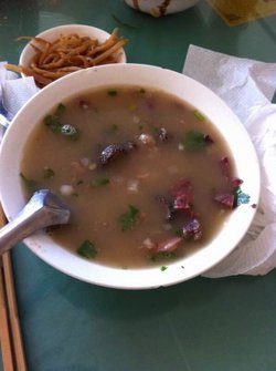 去中医医院早上抽血,很早很早去,大概8点多抽完,然后到附近吃早餐,看到白魁老号里面卖早餐就来了。这家店坐车到交道口路口东下车往西走200米,路口东北角就能看到。里面有两层,一层小吃二层正餐,环境还比较好,态度一般吧都,因为吃的时候要餐巾纸都挺半天。先换餐票,换了20块钱的,我们俩买了面茶、八宝粥、糖油饼2个和烫面炸糕2个。我喝的面茶,麻酱真不少,满满的一层,挺香的,还有芝麻,不过下面的棒子面粥太稠了,喝着挺干的,倒是味道挺香的。八宝粥也不错,粗略数了一下应该是8种材料,一大碗,熬得挺香的。糖油饼,我很喜欢,上面一层红糖,软软的,挺香的,还有些热乎呢,不过女儿貌似不怎么喜欢。她倒是喜欢炸糕,其实炸糕我也喜欢,烫面的,这个也是比较热乎,炸的很酥脆,外酥里软的,里面软糯糯的豆沙馅,甜甜的豆沙馅,很棒,最后又买了3个给老婆带回去,因为她也喜欢。