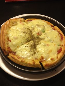 下班过去吃,要的是至尊批萨,等了大概10来分钟,端上来发现跟图片差太多了简直。上面糊着满满一大层奶酪,批萨边出来好几层,更像个酥皮什么东西。结果还没给上餐具,现找服务员要的。因为奶酪太厚,切了半天才切断,下面有零星的彩椒粒,大小比小拇指指甲还小的块。萨拉米香肠切的很薄,没吃出味道来,还有个泥肠还是什么那个有些许的香肠味道。其实他家其他的东西也还行,不过就这个批萨来说以后坚决不点这款了。查看更多