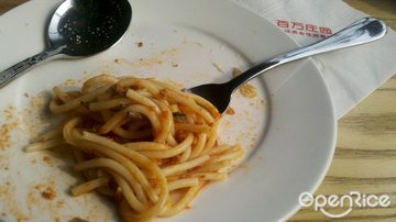 一进门就看见了满天飞的苍蝇,看见旁边的服务员爱答不理的,只好点餐了,要的比萨和意面,一杯奶茶,奶茶以牛奶为主,超级甜,喝了一口就腻了,比萨的坯子烤的太酥脆了,一口咬下去,都能掉渣子,上面的奶酪倒是挺多,但是没有香味,意面刚上来的时候尝了一口,赶紧让服务员再加点酱了,否则一点咸味都没有。