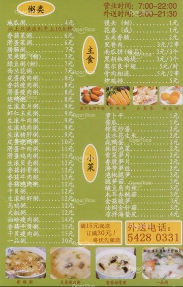 这家店的门面看起来还是很干净的清新的一抹绿色使人看了就觉得很有食欲小店的布置 简洁中透着一股霸气大理石的桌面显得格外有质感供应的食物主打的就是粥了从早上人们早餐要吃的白粥 南瓜粥到人气高的皮蛋瘦肉粥 菜粥 黑米粥甚至于鲜虾干贝粥 清香牛蛙粥这种也都有提供除了粥以外 还提供各色小食锅贴馒头很好吃 1元一个 比普通的煎包要少很多油还算健康另外还有里脊肉 南瓜饼总之杂七杂八的 管饱绝对没问题不用担心喝粥容易饿另外小店晚上也是很晚关门的有吃夜宵习惯的朋友走过路过 不要错过了…查看更多