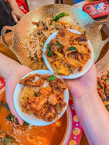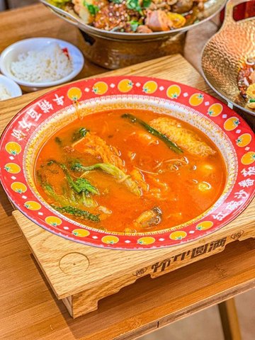 番茄豚骨汤锅底 / 娃娃菜 / 莲藕片 / 莴笋片 / 香菇 / 油豆腐