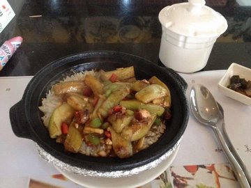 中午就在秀玉吃煲仔饭,既方便又饱肚子。这个鱼香茄子我还是第一次吃,等服务员大妈将酱汁叫上滋滋作响的米饭上,一股菜扑鼻而来。鱼香茄子味道还是挺好的,茄子很粗一条但是烧得软的,而且非常入味,混着调料汁米饭也变得特别有味道,咸咸辣辣的。秀玉的煲仔饭一般是没有焦焦的锅巴,最多是硬硬的米饭,其实这个更像是盖浇饭吧。出来没有的锅巴,其实里面软硬适中的白米饭味道也是不错的。这个饭还送了一杯玉米排骨汤,味道比较清淡,配咸咸的鱼香茄子倒是正好。