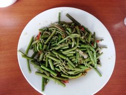 秀玉红茶坊环境不错,价格小贵呢,要了很多特色菜,其中一个很有特色,颜色绿色的,是那个特色的野菜那种,口味微辣,有很多的红椒丝,搭配起来很好看,味道很爽口,很不错的开胃凉菜呢。