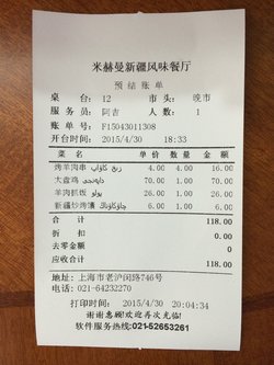 新装修好的招牌看上去洋气多了,门口还有烤羊肉串的摊子,最近经常路过所有决定去拔草。工作日晚市6点多到的,进门才发现店面不大,装修也略显简单,只有墙壁上挂的一些装饰品稍显新疆特色。走进去后没有服务员接待,看到只剩下最后两桌位置赶紧坐下,过了一会儿老板终于发现了我们于是拿了菜单过来,服务员也赶紧给我们倒了茶水,茶水味道很奇特,不知道是什么品种的。翻了翻菜单发现品种很丰富,又看到隔壁几桌菜量都很大的样子,于是选择困难症就出现了。正在纠结之时老板过来给我们点菜,本想让他等一下的但是他似乎是个急性子,抢过菜单给我们推荐起来,既然这样我们就只能跟着他的步伐走了,顺带说一句老板的上海话说得超级好。羊肉串提前就叫了,所以下完单不一会儿就送上来了,味道一般,稍稍有点烤过头了汁水没那么多,其他菜则是近20分钟一个没上。7点不到门口已经有人排队了,吧台上提供免费的烤包子就过去拿了一个,虽然是冷的但是那个馅儿我很喜欢。忍不住了刚想叫服务员的时候终于上了一份炒烤馕,饿晕了立刻开吃,很油很重口但觉得超级好吃,而且6元一份价格亲民。吃完之后又是漫长的等待,第一次感觉新疆菜也能当西餐吃,吃完一道才能上下一道。羊肉抓饭26元,中份的饭量加一大块羊排肉,羊排又是烤过头的节奏,而且估计是事先弄好的,所以已经冷掉了,味道一般。大盘鸡70元,份量中等,味道一般,性价比不高,不知道为啥是推荐菜。服务员都是新疆人,大多很客气,特别有个小哥一直笑得很灿烂,态度都不错,就是希望服务上能够更加主动点。
