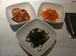 到这家新开的韩国料理店吃特色。可能是新开的缘故,而且店的地址有点偏,所以周日晚上的饭点,店里的客人没有几座。这家店,从门外朝里望进去,就是一副清爽干净的感觉,走进去,这种感觉更加深刻了,店堂很大,整体给人的感觉是简洁时尚,被分割为几个区域,有单人就餐区,自然也有双人和四人的卡座区域,而且每个聚餐区域都是半开放式的,所以同样显得很宽敞明亮。在店面右边的卡座里落座,店员就送上来白水河三样小菜。毕竟是韩国料理店,用来装水的水壶都是乐扣乐扣。三样小菜,萝卜丝、海带丝和泡菜,都是清爽的口感,味道却平平的。他家的菜单,其实很简单,都是一些定食类的,可以选择的内容不多也不少。我们点了双人鸡肉铁板烧加年糕。店员很快在厨房配好了菜,将鸡肉、年糕和洋葱等配菜装在一个像是平滴火锅的的容器里端了出来,原本每一张桌子中央都有一个炉子可以烧煮的,因为店里的人少,店员就在旁边桌子的路子上,帮我们加热食物,等烧好之后,端到我们的桌子上。于是我们面前,就有了一大盆子的鸡肉烧烤。因为加过里酱料,锅子里面的食物,几乎都是一种颜色了。年糕的确很糯,很有粘性,个人觉得非常好吃,可惜它在这里面只是配菜的角色,没吃几块就没了,反而是鸡肉有很多,店员在烧的时候,还加入了罗勒叶,让鸡肉显得更加的香浓了。鸡肉其实也很嫩,但是这么一大盆吃下去,多少也会有点腻。…查看更多