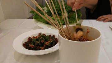辣的跳去的第一家红鼎也是目前认为最好的一家价格是有点贵 但是生日之类人少点的聚会还是不错的环境很好 服务态度也是服务员帮你下东西 捞起来分配到你碗里你就坐着等吃就行 很惬意哈那个冒气的生牛肉 很好吃 忘记叫什么了下次去一定要问问汤很好喝辣的跳喜欢锅底 羊肉片