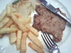 这家店的店面挺不错的,比较宽敞,看起来非常干净整洁,店里面的装修还不错,比较有欧式田园风味的感觉。店里面的消费在人均80左右吧,西餐店的正常水平了。店里面的服务还可以,比较有礼貌,看起来还是挺专业的。点了一份猪扒,这个味道还可以吧,猪扒的分量还挺足的,比较大一块,做的比较香嫩,配了薯条,蔬菜之类的配菜,口味还可以。另外还点了一份番茄汤,这个西餐的汤品我是不太喜欢了,不过BF觉得还不错,一般都是给他喝了。薯条比较大一盘,炸的很香脆。总的来说还是不错的吧,试试无妨。