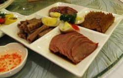我下班早,又离他们家比较近,所以一下班就冲去,把菜点好,等其他吃客到来。 芥末木耳,木耳好啊,通血管啊,作为吃货,要防患于未然,既满足口腹之欲,又尽量保证健康啊。木耳一小朵一小朵,芥末味不是很浓的,吃吃蛮好,清清爽爽。 熏鱼,还行啦,我觉得有点小干啊。 红枣南瓜,这个是为满足广大人民群众需要点的,我本来不太爱吃红枣神马的,挑了块南瓜吃吃,很酥烂,不是很甜。 大拌菜,各种绿叶蔬菜啊、小番茄,用醋汁拌了,挺开胃的。 极品牛肉粒,算他们家招牌之一吧,服务员推荐的,确实味道不错,牛肉粒蛮大块的,但是一点不觉得老啊,吃得时候不会筋筋拉拉。 元宝虾,虾个头挺大的,外面炸得很香脆,虾的肉质很Q弹。 咸蹄髈,给力的菜啊,蹄髈皮怎么处理的啊,煎锅还是怎么着,有点脆皮,咸蹄髈肉喜欢的,咸鲜的口感,而且肉质有嚼头。 柠檬鸡,这个有点偏甜了,一般性。 西兰花,一直很喜欢吃西兰花哦,美味又健康。 生煎包,个头也不小,皮子有点小厚,还行的,肉馅蛮鲜的,也有汤汁,好吃的。很喜欢焦焦脆脆的底。 价格还行,环境和服务一般吧!查看更多