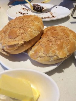怀孕的时候吃的特别清淡,结果就爱上了港式,更爱上了翠华。翠华比较有名的是奶油猪仔包,面包香香的,上面的奶炼甜甜的,非常好吃。虽然如此,但自己还是更喜欢传统的牛油包,特别是热烘烘的牛油包夹着冰的黄油,慢慢的融化,把奶味带入面包当中,真的是很不错哟。其次他家的鱼蛋粉也不错,很清淡,汤汤水水的,黄蛋很嫩也很滑,非常的鲜,原汁原味那种。