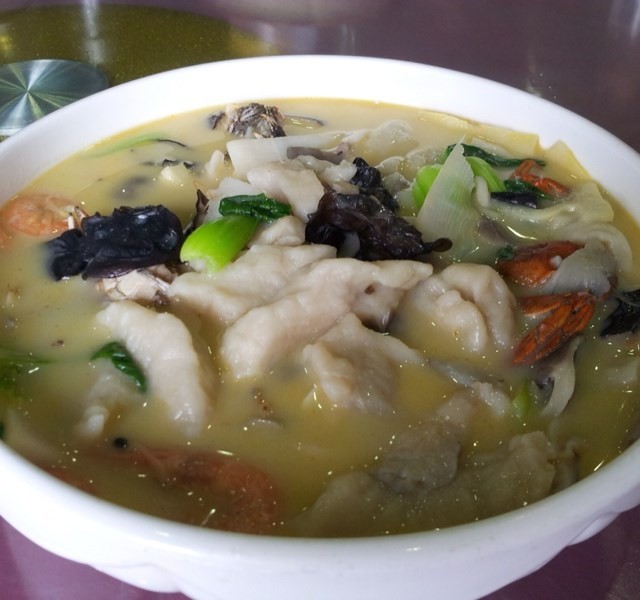 千年难办才会去周浦镇,原因就是家里有远房亲戚请客吃他们当地的老八样。其实我之前木有听说过老八样,后来才知道原来是本地菜,还是挺好奇的,毕竟以前木有吃过。貌似周浦类似的店还是比较多的,去了一家比较出名的,环境很普通的,赶脚已经有点年代了,挺朴素的。老八样是哪些已经不记得了,只能说说印象比较深刻的。肉皮汤挺特别的,很大一盆,上面的肉皮很有弹性,吃起来不油腻,汤比较鲜美,农家的味道。还有羊肉的味道也值得一试,膻味不重,但是特别有味道,肥瘦恰到好处,即使不沾酱料也不错,推荐喜欢吃羊肉的朋友。总之就是农家菜吧,换换口味还是不错的。