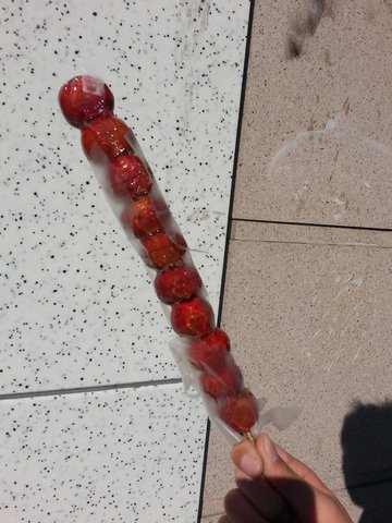 冰糖葫芦,以前记忆中的,只有山楂,现在不同了啊,有好多口味的,有草莓的,橘子的,还有苹果的,一串串挂着,红红火火的,看着就喜欢,最喜欢的是草莓口味的,草莓的清香和外面的一层糖,混合在一起特别甜,而且草莓可以直接吃,更方便…查看更多