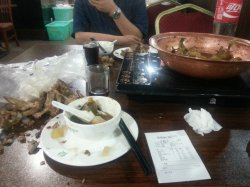 地理位置非常不容易找,饶了好几圈再找到的,位置太偏僻了。店面挺大的,很陈旧,店员没什么统一着装,餐具,锅子的logo和店家名字都是不一样的~点了特色羊蝎子小锅,128元,里面还有冬瓜,加了一份蟹肉棒,两个人吃很撑。冷菜剁椒皮蛋辣的在也味,很不错~查看更多