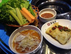 微博活动的双人套餐,菜品很丰富,特爱光阳烤肉,蜜制过的烤肉,嫩香无比,是我所吃过的韩国料理中最好吃的烤肉,赞;炉心肉用生菜包着吃,口感棒;大酱汤里的料好多,好鲜美,炒年糕,年糕QQ,酱料美味;同时量也好多,吃得好满足。下次有空再来尝尝光阳烤肉,交通还是蛮方便的,9号线合川路下来,走5分钟就到了,呵呵。