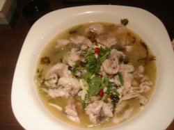 这里的米线,果然做了很多改良。除了酸菜鱼米线,居然还有水煮鱼米线。这次点了酸菜鱼的尝尝。上来一大碗,因为米线是沉在下面的,所以只看到一大片鱼肉在上面。不知道的,只以为是酸菜鱼这道菜呢。汤很鲜美,稍有偏咸,可能是酸菜浸的久的关系吧。汤头从色泽、口感上来说,都是算浓的,鱼肉还是比较大块。米线很滑,唆一口比吃面条滑的多了,吃起来比较Q。查看更多