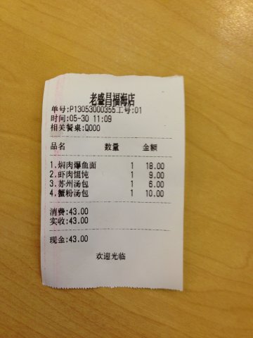 早餐在老盛昌要了一碗馄饨一笼汤包,汤包上的稍慢,但是味道都很不错,总共花了10元,吃了很饱的一顿,其实两个人吃这些也够了。外面还有很多人排队买烧麦和包子吃。只是醋像兑过水的,不是很好。环境很干净,人不是很多,可以很安静的吃一顿饭。好像这里还买中午的快餐什么的!