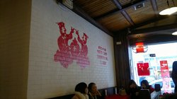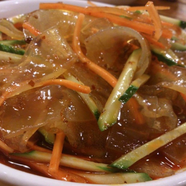 一进门就看到亮点,透明地板踩着有趣,油泼扯面(13元):辣的很香,面条像面皮似的,不劲道但很好嚼,还有豆芽及蔬菜;土豆丝煎饼(12元):就是饼包着土豆丝,不是很MATCH,辣味和上述菜类似;牛肉芹菜饺子配酸辣汤,饺子放在汤中皮吸收了汤的重口味,馅很赞,其实GIGI一行共点了三种口味的饺子,味道最好的就属它了,酸辣汤和传统味道的也不尽相同,更有日式味僧或昆布汤的感觉。