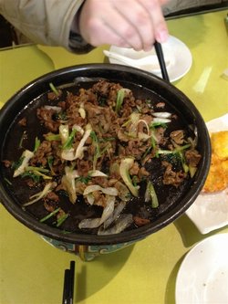 这家店就在前海东沿,店面不算小,布置的古香古色的,来这里旅游的人比较多,对老字号都比较感兴趣。他家的烤羊肉是必点的,92元一份,羊肉还挺薄的,用香菜和葱丝一起炒的,下面的炉子还能加热,吃到最后都是热乎的,夹烧饼更香一些。查看更多