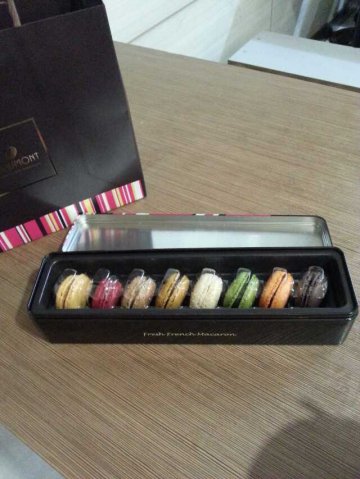 肖蒙花式马卡龙价格真心不便宜噢,一狠心买了三个不同种口味的马卡龙,觉得相比而言还是其中的青柠檬柚子是我所喜欢的,它的颜色是绿色的,甜味当中又透露着一丝的酸爽,当中的那个夹心味道倒是觉得有点太甜了,不是很喜欢,还是比较喜欢马卡龙外面的口感和味道。…查看更多