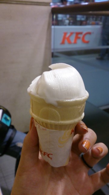 KFcc的价格东西是越来越具了,但是还是有人会喜欢吃他们家的东西,比如我,嘿嘿,我比较喜欢它们家的鸡汁土豆泥,圆筒,吮指原味鸡,香辣鸡翅,新奥尔良烤翅,雪顶咖啡等等,它们家的土豆泥的味道不是每个人都能接受的,喜欢的人觉得很好吃,但是不喜欢吃的人觉得它有股中药味,很难吃,这个要看每个人的口味如何了,喜欢吮指原味鸡的理由是皮脆,肉香,肉很厚实,很实在,汁水很多,圆筒原来价格才2.5块一个,现在要买4块一个真心贵,但是味道很好,奶香味很足,但是分量不是很多耶!