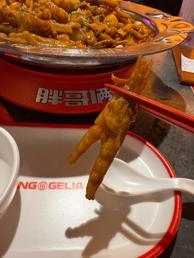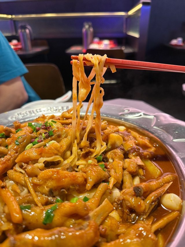 都係深圳先至有嘅餐廳 疫情前已經開始食佢 近年開始愈來愈多分店雖然佢個名係「肉蟹煲」,但係我去親都係叫呢個雞爪煲基本上佢呢度所有煲都係同一個味道,只係入邊嘅材料唔一樣。除咗我經常點嘅雞腳煲之外,另外仲有蟹煲,蝦煲,牛蛙煲等等其他唔同材料組成嘅煲雞爪煲入邊除咗有雞爪之外,仲有年糕,薯仔同埋萵筍。另外我每次都會加埋面條。🥘啲薯仔同雞腳已經炆到非常之腍,可以話係入口即溶。而且醬汁非常之濃味好適合我呢啲鍾意重口味嘅人。有試過其他食同類型菜式嘅餐廳,但始終都係覺得呢一間比較適合自己口味😋😋…查看更多