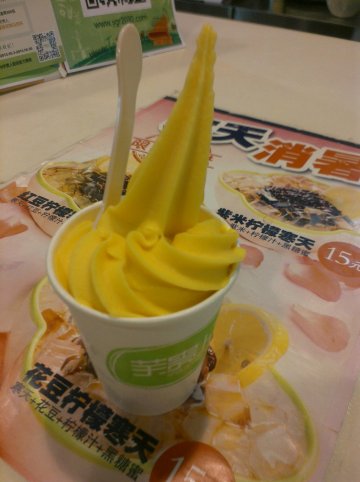 在某团购网站上,一角钱抢购了他家原价6元的芒果或仙草冰激凌,有天路过,乘着天气还有些热,去吃掉了。这家芋贵人,在我格B1的中间部分,不是很大。因为略显仙草的苦味,而且想到如果是冰激凌的话,仙草的苦味会更加浓厚的,于是选择了芒果味道的冰激凌。6元的冰激凌,店员挤了满满的一杯子,不过吃过之后,我觉得冰激凌里芒果的味道,显得有些淡,而且冰激凌的冰,让水果的味道更加不容易显现出来,整个口感就像是在吃一款有点点甜酸味道的冰激凌,不太能得我心。