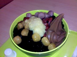 眼瞅着大家都去把抽到的“芋贵人”试吃掉了,并且纷纷发了汇报帖~矬小白每天看到这个快递袋子和试吃券心里那像一个喵咪抓啊~~~~~~~~~~~~~~~~~~~~琢磨着要赶紧去吃掉吃掉~之前一直木有时间,然后慢慢等啊慢慢等,慢慢等啊慢慢等~就等到过端午了~耶耶耶!好担心端午节不能用那个试吃券~于是屁颠颠的跟小小丸子发了短信问说过节可以去试吃嘛?小小丸子好high好high的告诉我说只要券后面木有特别说明,就是可以的啦~快去吧快去吧~于是我就放心了,拐了我的小跟班,一起去光谷了~话说矬小白家住汉阳,去光谷好远好远好远啊~那天出门还下雨,溅的我一腿泥巴,真是毁了我出门前拗了半天的造型~T-T话说十五中到“亚洲农贸市场”那一带的路口真是差~我们一直都在坐蹦蹦车.....矬小白跟猴纸小跟班屁股都坐痛了~才到目的地——光谷~内牛满面啊~喜极而泣啊~端午节光谷也好多人啊,还好到了之后雨停了~天气有点闷热~矬小白的“遇贵人”的旅程就这样开始啦~将将将将~~~~1楼的淘宝街~顺着这里走过去,就能“遇贵人”~从这里反方向走去,就能找到厕所,解决燃眉之急~哇哈哈~我就是先去了一趟wc,发现“遇贵人”的地点的~凹耶~!走着走着,贵人就出现啦~好多人排队点餐哟~人气挺旺的~然后矬小白跟店员MM说明来意,店员MM就好热情好热情的给矬小白推荐他们的芋圆品种~矬小白要的是大芋丸2号~我还问了2号跟1号的区别是:2号里面是红豆,1号里面是花豆~猴纸小跟班说想要吃红豆的~于是我点了2号~嘿嘿~点完餐~就落座啦~店里满满都是人~好不容易有个位置坐~T-T店里是绿色的基调~夏天的话,看起来挺清凉的~大家都在埋头吃吃吃~黄色的是金薯丸~紫色的是芋丸~配了植物奶球~这一碗分量很足~建议:如果不是太饿,就2个人吃最好~如果太饿,就1个人吃~会很撑的~嘿嘿~最下面是仙草汁做的炒冰~然后是仙草冻~然后是红豆~然后是芋丸+椰果+珍珠果~我想说说珍珠果~他家的珍珠果真的很赞~有浓浓的黑糖味~其实也就是红糖啦~但是很入味很好吃呀~旁边有坨冰淇淋~我看大家有的说是芋头味,有的说是巧克力味~但是我觉得是仙草汁+牛奶做的~因为入口的那一瞬间,有很浓郁的仙草的药膳味~真心觉得是仙草汁+牛奶做的冰淇淋~肯定没错~!!!金薯丸子~比较小颗,剖面应该跟五毛钱差不多大~味道很好~很Q~芋丸~跟金薯丸一样大~淡紫色很美~这些煮的很透很透~很好咬~大家完全不用担心~~哈哈哈~期间,猴纸小跟班都吃的陶醉了~啧啧啧啧~店员都是帅哥美女~服务很好~空调也很凉快~避暑好去处~就是太远啦~不过现在汉口的店也开业啦~就近多了~真好~!哈哈~查看更多