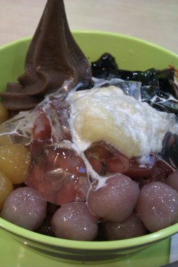 生意好到爆 里面坐满了人 还有很多人打包带走 种类很多 点了人气很旺的大芋丸1号 搭配一小盒炼乳 大芋丸1号里面有芋Q 花豆 烧仙草 奶油球 金薯 珍珠(卖完了 给我换成寒天了)还有一坨很像粑粑的冰淇淋 芋圆真的很Q 软软糯糯的 金薯也很好吃 一直不太喜欢吃烧仙草 就不作评价了 寒天就是透明的果冻 整体感觉就是不是太甜 味道自然 似乎没有太多的添加剂 夏天能吃到这样甜品很舒服呀查看更多