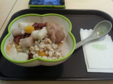 店面不大,但是这里的甜品一直都是印象不错的,这次点了芋丸2号,里面加了紫米、红豆、糯米等,吃上去口感很软,味道也是带有一点点甜味。而汤更是改成了红豆汤,口感也很甜蜜,冬天也可以吃这里的甜品哦~!