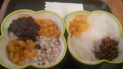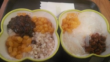 来自台湾的芋贵人,位置还是很好找的,就在永辉超市出口买单的对面。环境还是可以的,有他们家的产品挂在墙上宣传的,还有典型的装饰,绿色,上面还写有字的哦!座位区域简单而整洁,还是可以的。在网上团购的,8元一碗,还是多大一碗的。可以在三种里面选择的。小芋Q1号(小芋Q+小金薯+薏仁+花豆),小芋Q2号(小芋Q+小金薯+仙草+花豆),小芋Q3号(小芋Q+小金薯+花生+花豆)。选了一个Q1号和Q2号,由于去的时候说小芋Q没有了,换的大芋的。我觉得还是可以的。一碗薏米的,下面有冰的,味道还可以!另一碗个人觉得有点甜,里面有椰丝的。我觉得适合大热天来吃他们家的小芋系列,因为有冰的,个人不是很喜欢在不是很热的情况下吃冰的,有点遭不住。总体他们家的这个还是不错的!