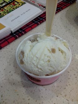 在里面某个手扶电梯的右侧,确实不太好找,不过后来再去我就很快找到了。。我买的是酸奶3号(奶酪味)配红豆,喜欢这样的味道。店里还代寄明信片。去得多了,吃的品种也就多了。天气热的时候去吃一大份芒果绵绵冰,真的是感觉很幸福啊。冰是用牛奶做的,特别香浓又清爽,芒果很新鲜,我有看到旁边的还没有切开的完整的芒果,好大一个,跟哈密瓜似的~~还有朗姆冰淇淋,也是我喜欢口味。