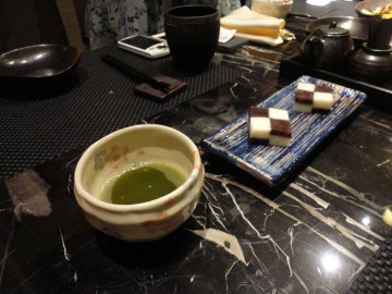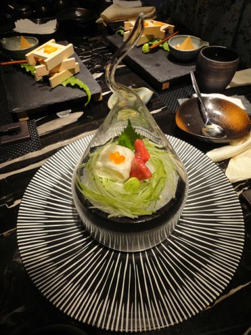 店里的装修比较有韵味,灯光不会很亮,比较幽静的用环境。石柱子或原木的设置用来起到隔离空间的作用,让客人在用餐时有更多的私密空间。座椅上都有一块不规则的花布,应该是为了配合花隐这个名字,整体环境有点禅意又很时尚。花隐的菜单很简单,只有文字没配图片,店员把菜单上的菜全部都介绍了一遍,背的真熟。点餐是按套餐来算的,358一客,加10%的服务费,将近400块一顿。花隐的服务很好,大家的笑容都很真诚,这样的服务费给的才叫服务费。part 1「沙拉」人生四味,很吸引人的一道菜,很多人点,四个小碟子分别为酸甜苦辣。店员也建议从酸甜苦辣这个顺序开始品尝。负责酸的鱼皮丝,挺爽口的,口感像海蜇丝。负责甜的里面那块是柿饼,外卖包着的没记错的话是鱿鱼。负责苦的,当然就是苦瓜了。负责辣的是明太子加蛋黄酱,大家都挺喜欢这个的。花隐料理顾名思义每道菜都有一种花part 2「汤品」吟酿豚肉味增汤沙拉吃完就到汤品了,卧底兄的味增汤,造型很抢眼。像个石磨坊,周围的黄豆是用来装饰的,味道就是味增汤的味道了。part 3「刺身与煮物」刺身荟萃上场很多wow~的一道,因为干冰飘啊飘,感觉很漂亮。刺身都很厚,三文鱼肥美,虽然日料不是很对口,但来吃还是要吃刺身。part 4「珍馔」TORO黑鲔腩这个玻璃盖子的造型,超级吸引人,花隐海报的主打。两片黑鲔腩,四个鱼子。鱼子吃起来还是腥,黑鲔腩可能抱得期待值太高,感觉油脂不是很丰富。也可能是日料不是很对口,吃什么都没太大的感觉。part 5「精选主食」岩烧雪花牛小排很吸引人的油花,份量精致,没记错是80g,没多少片。店员会先帮你试烤两片,后面就可以选择是店员烤还是自己享受DIY的乐趣。要的是7成熟,感觉是熟了一点,再生点肉质可能会更软。抹茶及茶点抹茶有点苦味,配上甜甜的红豆糕就刚好了。茶点红色部分是红豆,白色的吃不出来。part 6「和风主食」原盅鲑鱼炊饭其实吃到这里的时候已经感觉挺饱得了,这个鲑鱼炊饭的鲑鱼超级多,估计有容器的一半那么多。味道淡了一点,也比较干,可以加点酱油。part 7「甜品」可可香蕉布蕾球形物体是棉花糖,只看棉花糖真猜不到它是什么。把棉花糖拨开后,里面就是香蕉布蕾了,很甜的一款甜品,爱吃甜的推荐。 part 8「餐后饮料」柠檬紫罗兰沙瓦杯子上面的那些晶体是白糖,瓶子也很漂亮,这个大家都很喜欢,推荐。沙瓦是一种气泡酒,在制作过程中基本都挥发了,口味酸酸甜甜的很好喝。…Read More